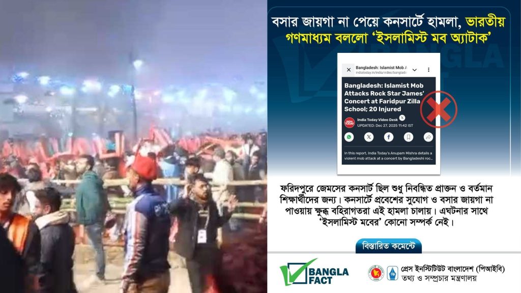 ফরিদপুরে জেমসের কনসার্টে বহিরাগতদের হামলার ঘটনাকে ‘ইসলামিস্ট মব অ্যাটাক’ হিসেবে প্রচার করা ভারতীয় গণমাধ্যমগুলোর দাবিকে ভিত্তিহীন ও অপপ্রচার হিসেবে শনাক্ত করেছে ফ্যাক্ট চেক প্রতিষ্ঠান ‘বাংলাফ্যাক্ট’। প্রেস ইনস্টিটিউট বাংলাদেশের (পিআইবি) এই মিডিয়া রিসার্চ টিম জানিয়েছে, মূল ঘটনার সাথে ধর্মীয় কোনো সম্পৃক্ততা ছিল না।